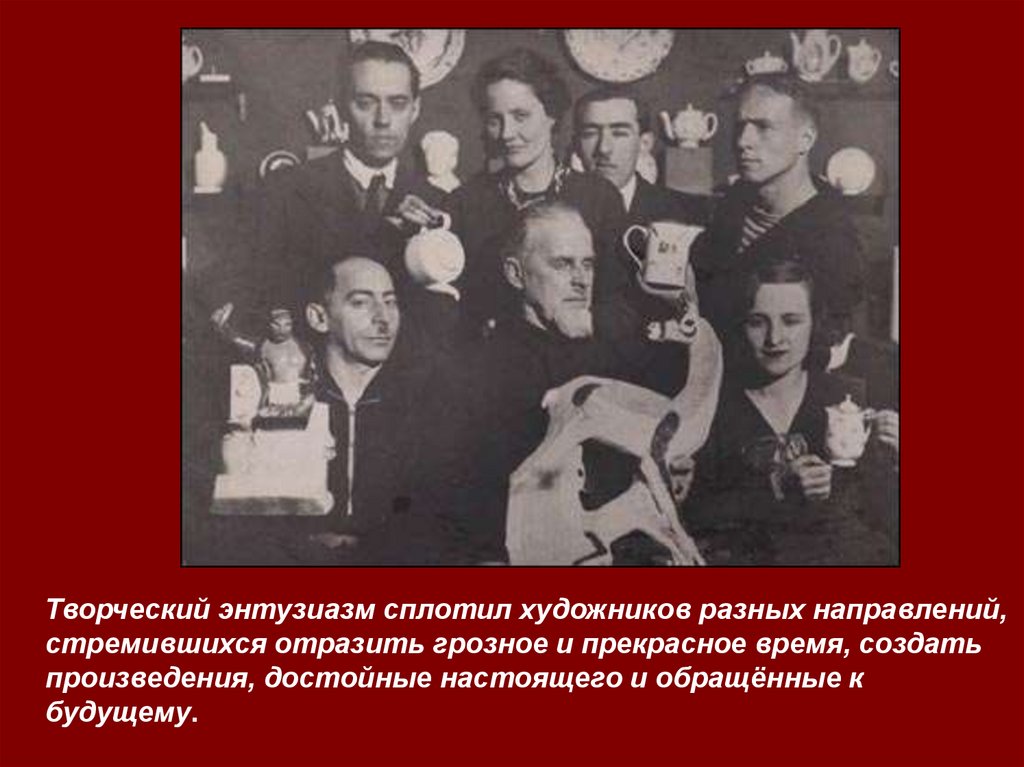 Творческий энтузиазм сплотил художников разных направлений,стремившихся отразить грозное и прекрасное время, создать