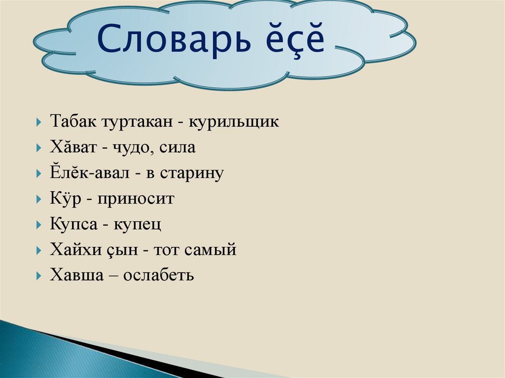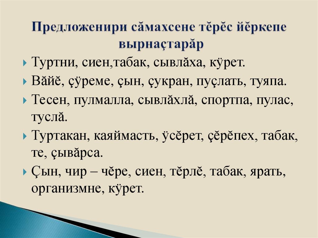 Туртни, сиен,табак, сывлăха, кÿрет.Вăйĕ, çÿреме, çын, çукран, пуçлать, туяпа.
