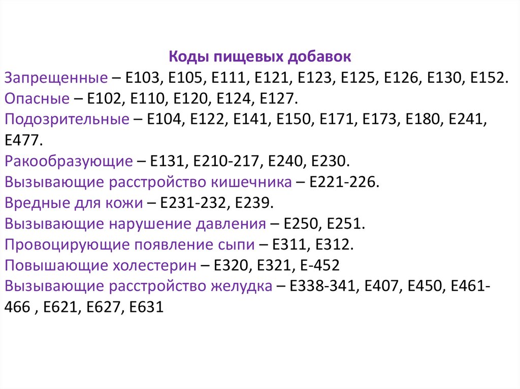 Коды пищевых добавокЗапрещенные – Е103, Е105, Е111, Е121, Е123, Е125, Е126, Е130, Е152.