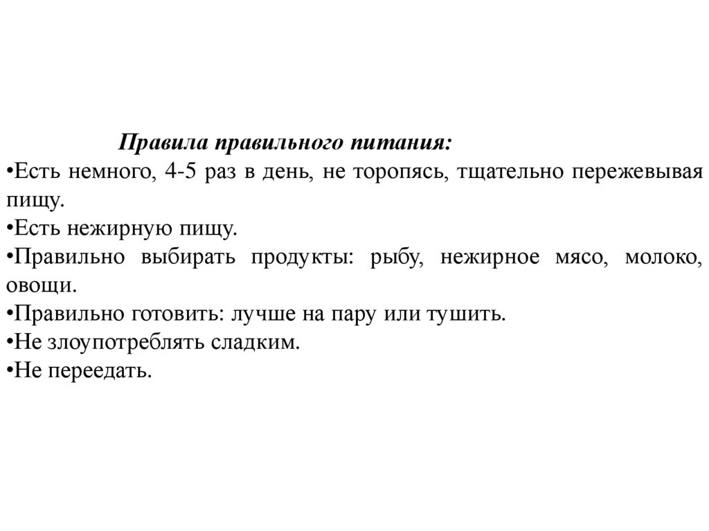 Правила правильного питания:•Есть немного, 4-5 раз в день, не торопясь, тщательно пережевывая