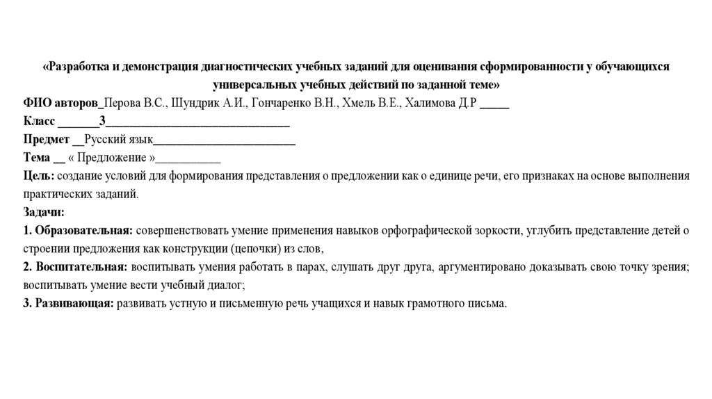 «Разработка и демонстрация диагностических учебных заданий для оценивания сформированности у обучающихсяуниверсальных учебных действий по заданной теме»