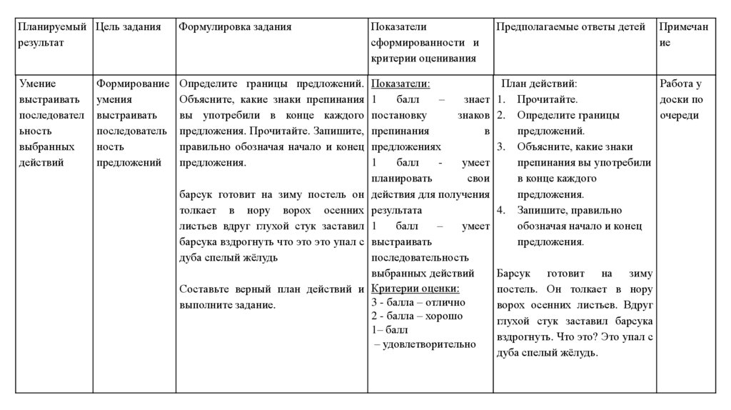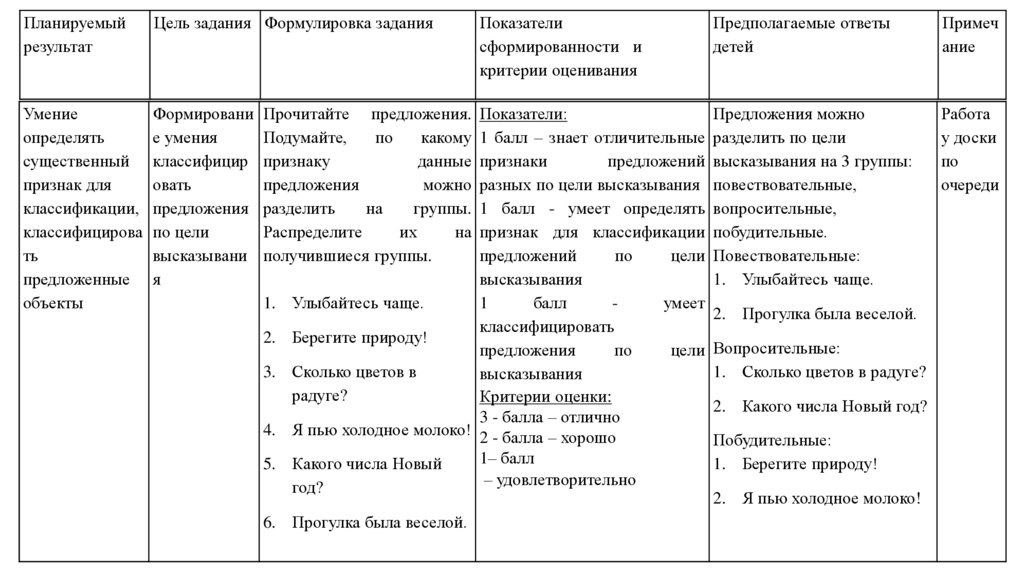 Цель: создание условий для формирования представления о предложении как о единице речи, его признаках на основе выполнения