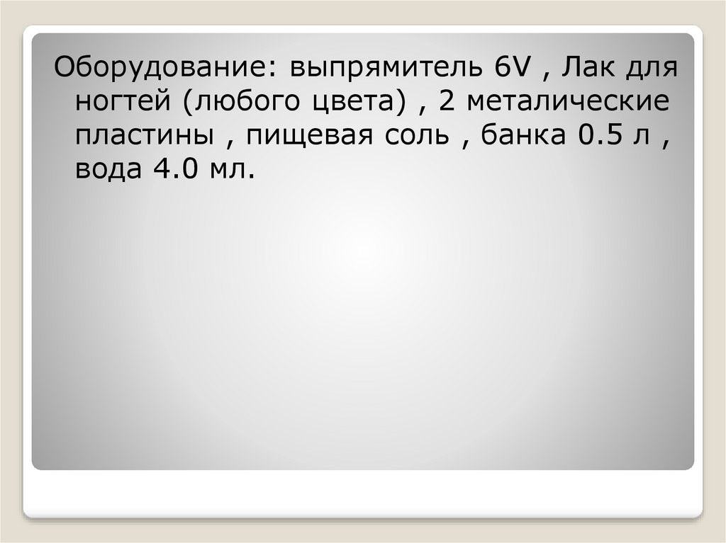 Оборудование: выпрямитель 6V , Лак дляногтей (любого цвета) , 2 металические