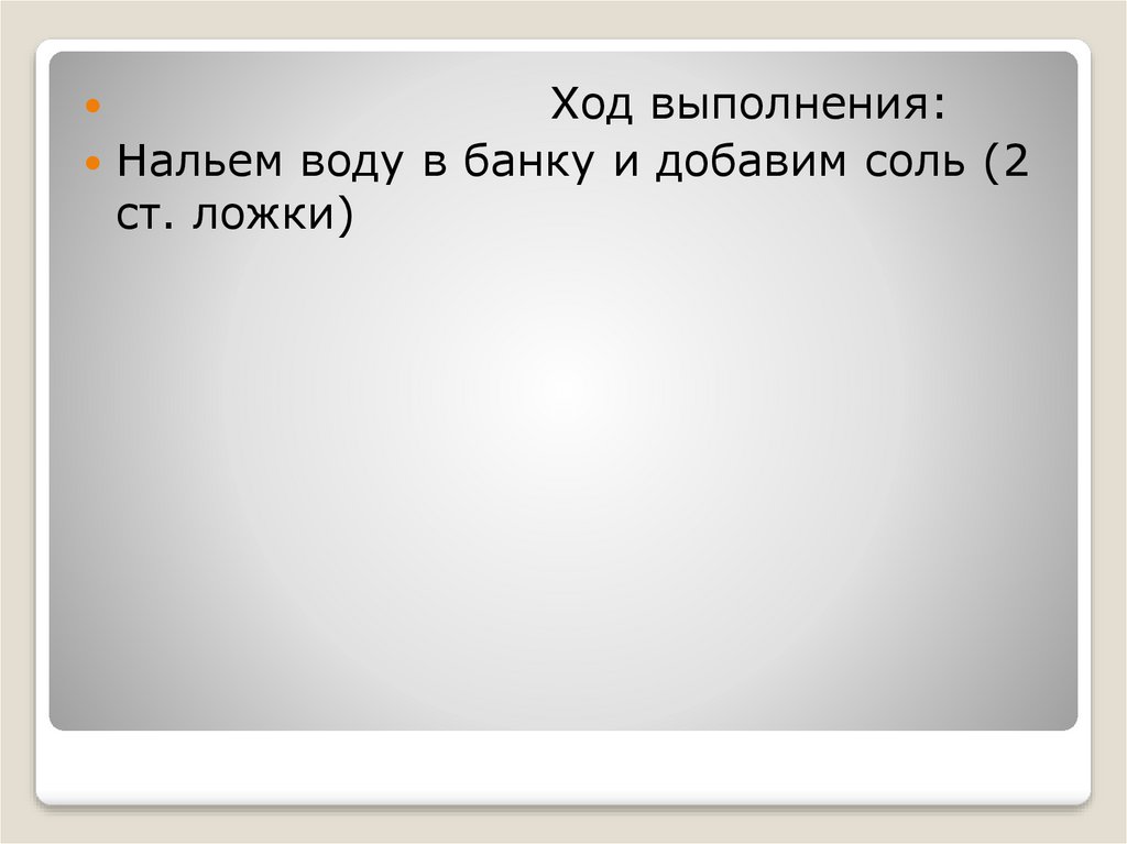 Ход выполнения:Нальем воду в банку и добавим соль (2