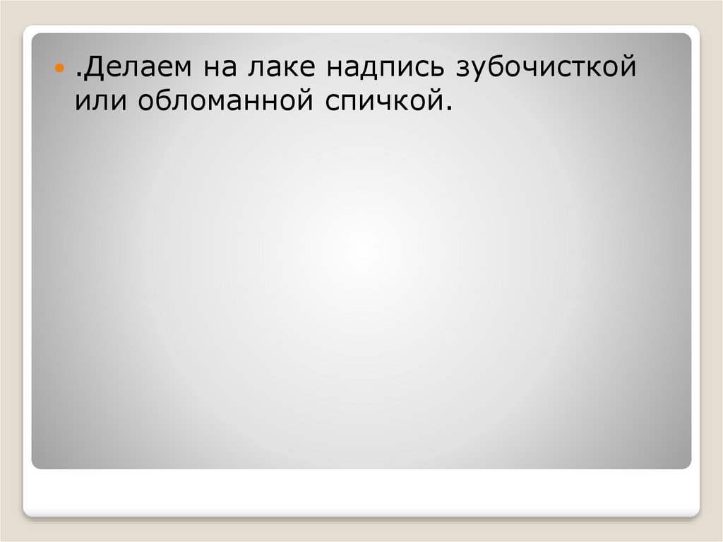 .Делаем на лаке надпись зубочисткойили обломанной спичкой.