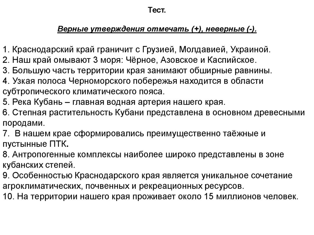 Тест.Верные утверждения отмечать (+), неверные (-).