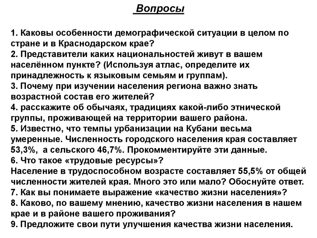 Вопросы1. Каковы особенности демографической ситуации в целом по
