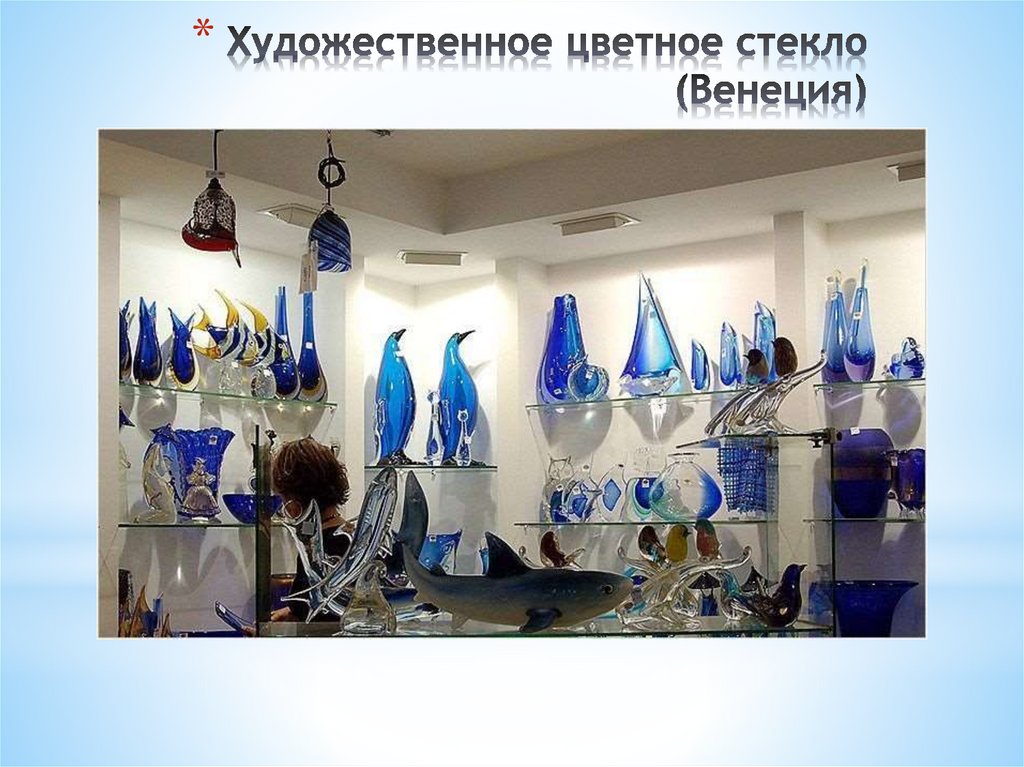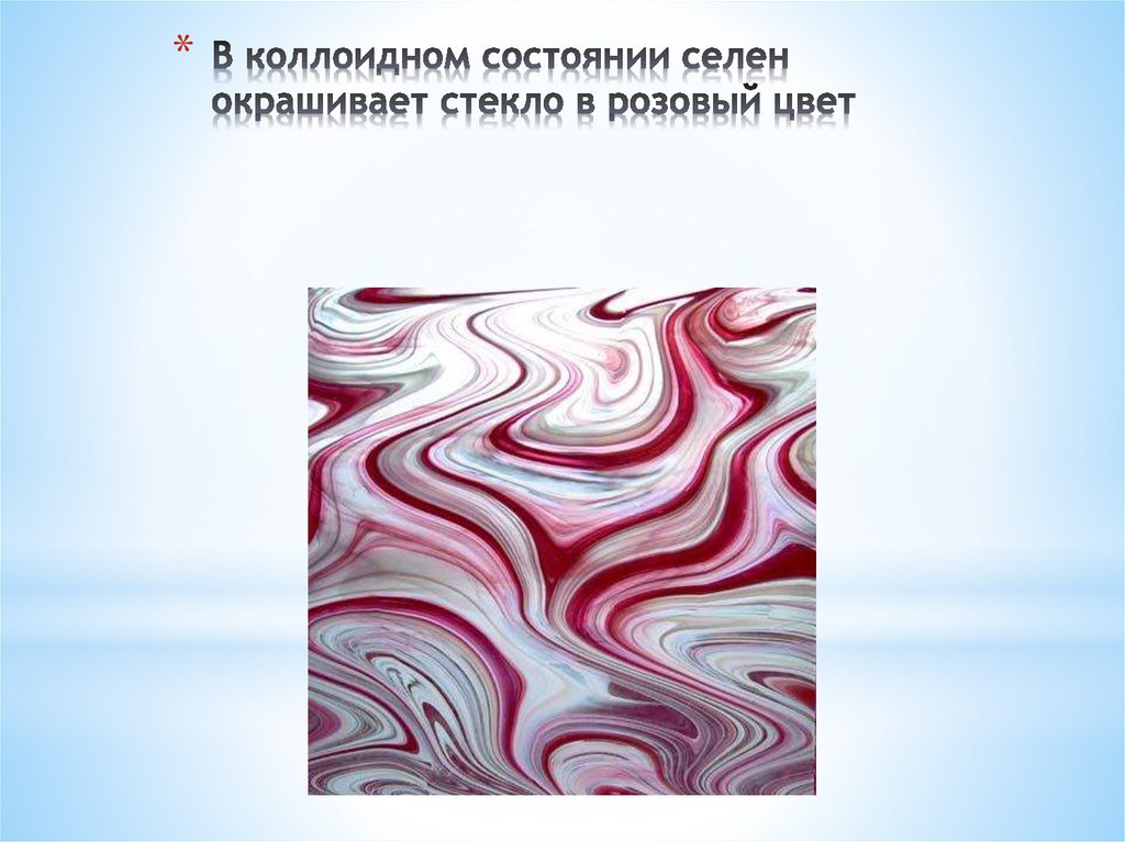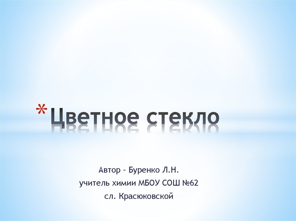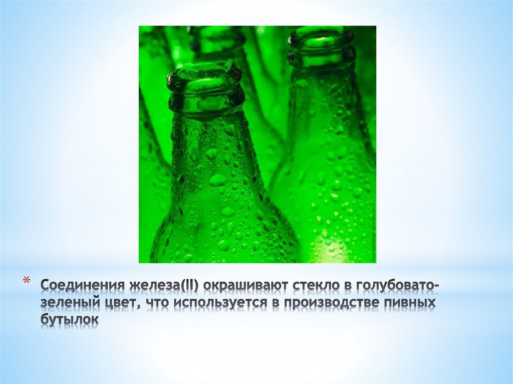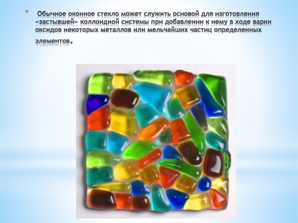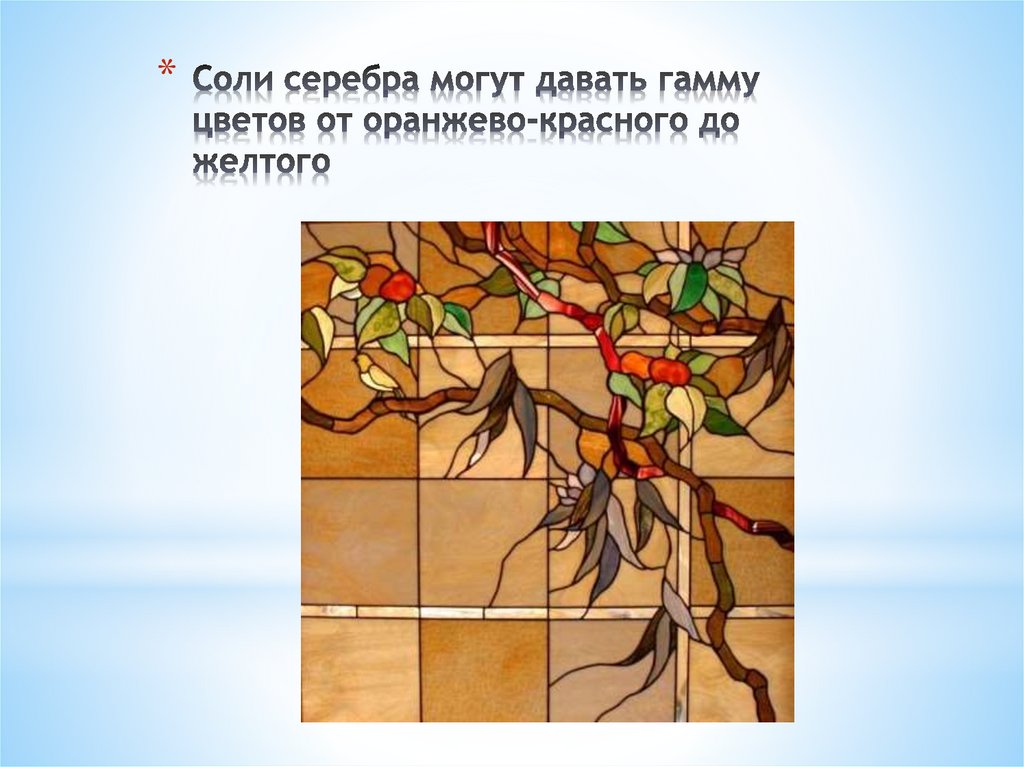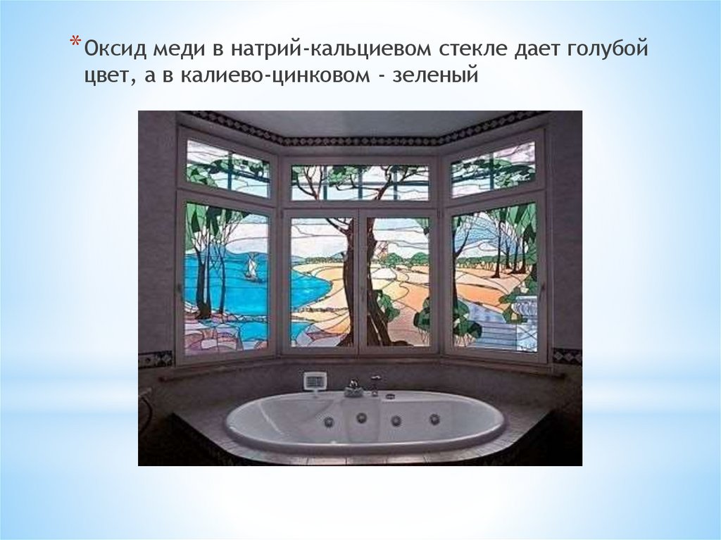 * Оксид меди в натрий-кальциевом стекле дает голубойцвет, а в калиево-цинковом - зеленый