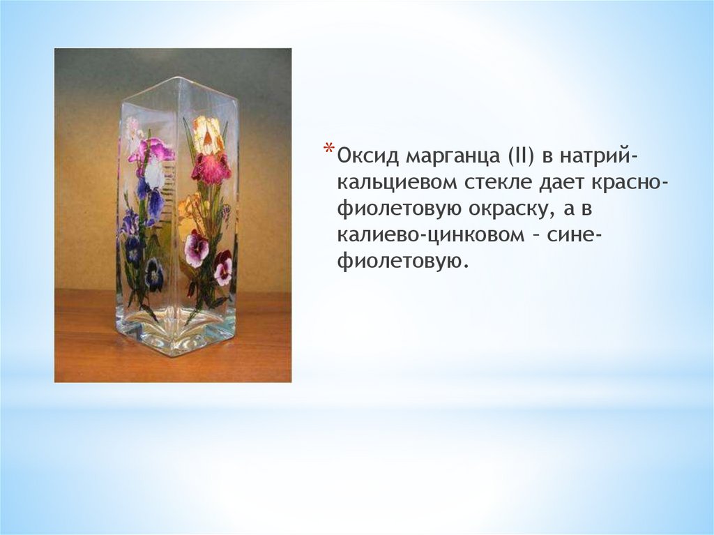 * Оксид марганца (II) в натрий-кальциевом стекле дает краснофиолетовую окраску, а в