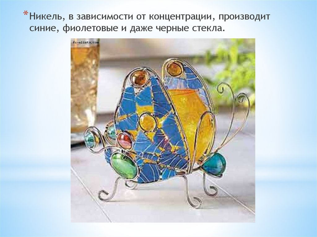 * Никель, в зависимости от концентрации, производитсиние, фиолетовые и даже черные стекла.