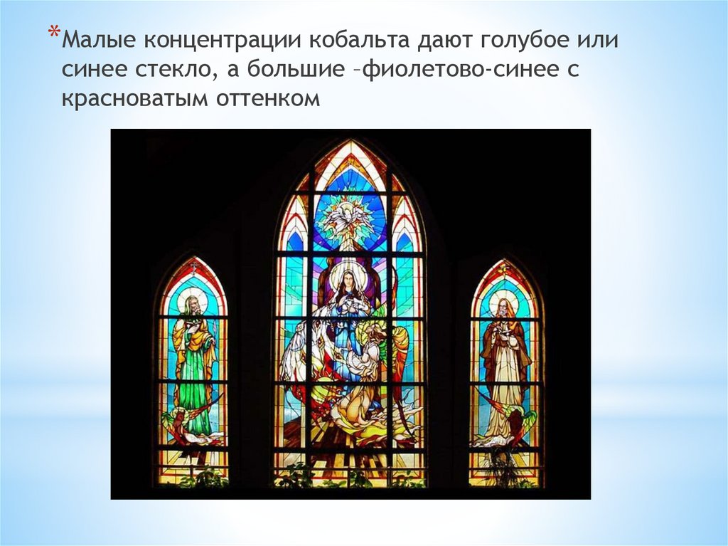 *Малые концентрации кобальта дают голубое илисинее стекло, а большие –фиолетово-синее с