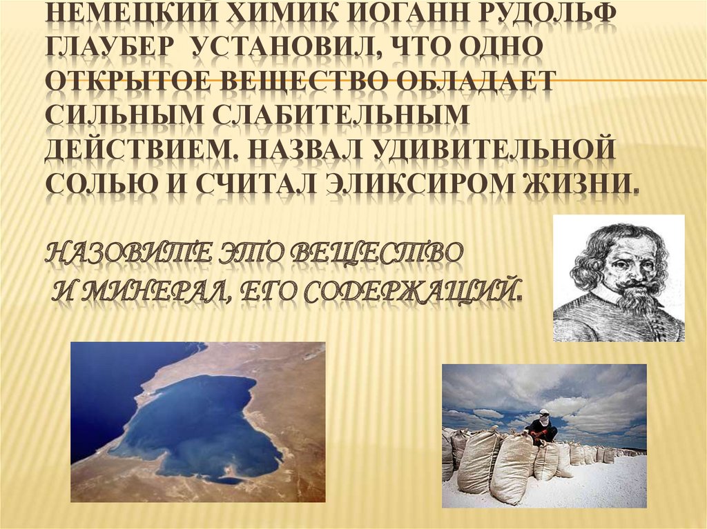 НЕМЕЦКИЙ ХИМИК ИОГАНН РУДОЛЬФГЛАУБЕР УСТАНОВИЛ, ЧТО ОДНО