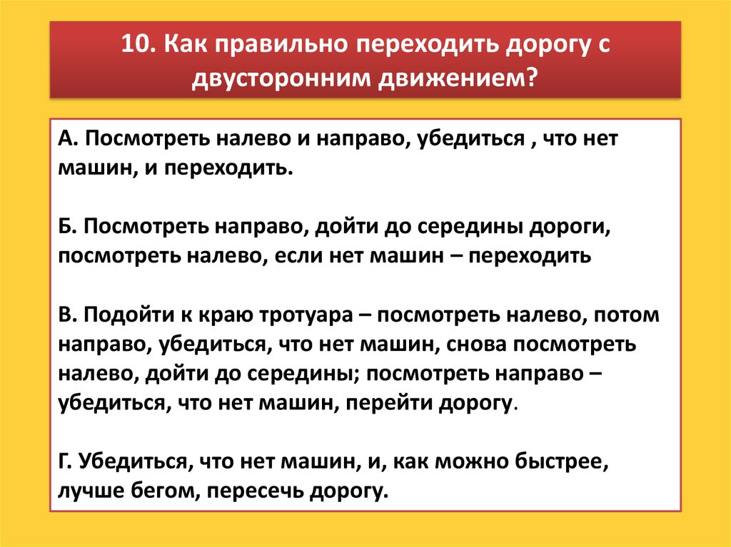 10. Как правильно переходить дорогу сдвусторонним движением?