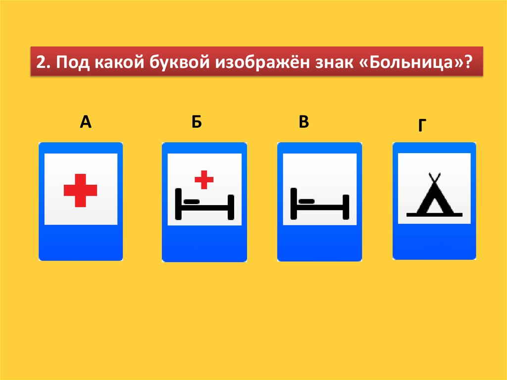 2. Под какой буквой изображён знак «Больница»?А
