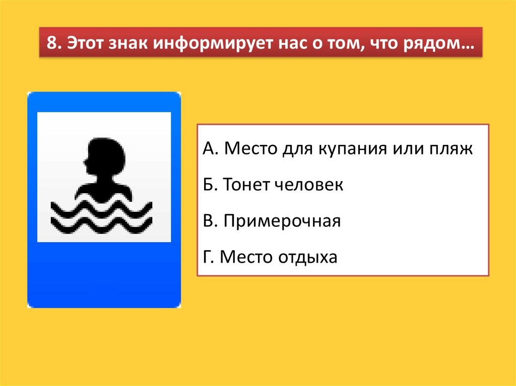 8. Этот знак информирует нас о том, что рядом…А. Место для купания или пляж