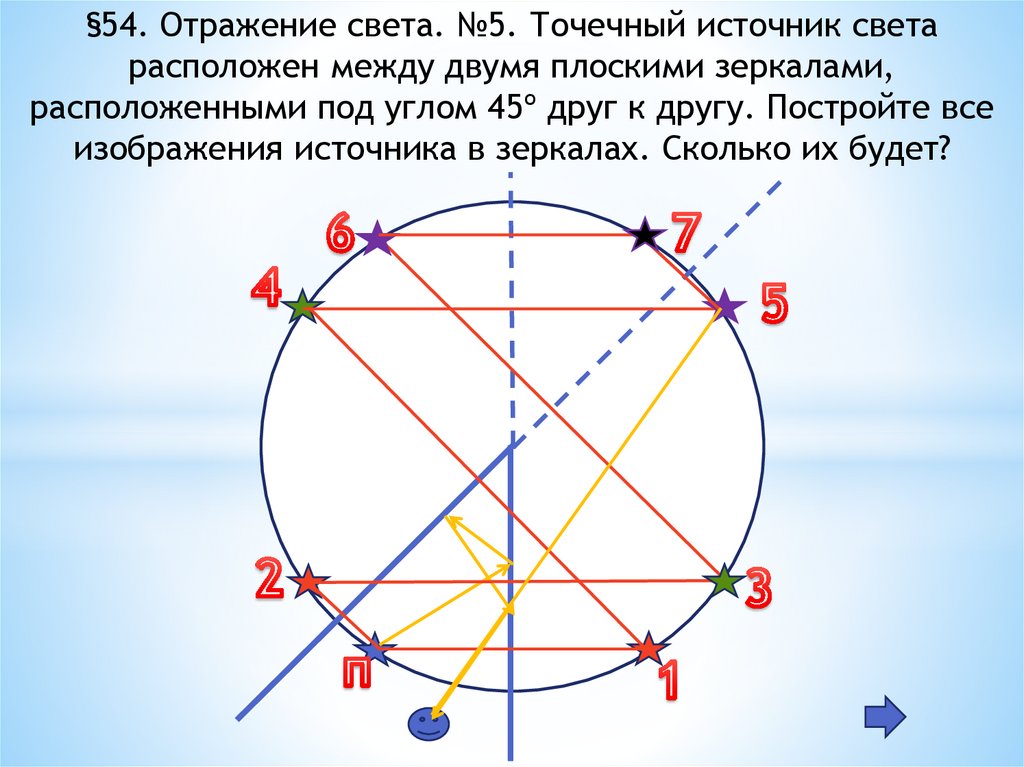 §54. Отражение света. №5. Точечный источник светарасположен между двумя плоскими зеркалами,