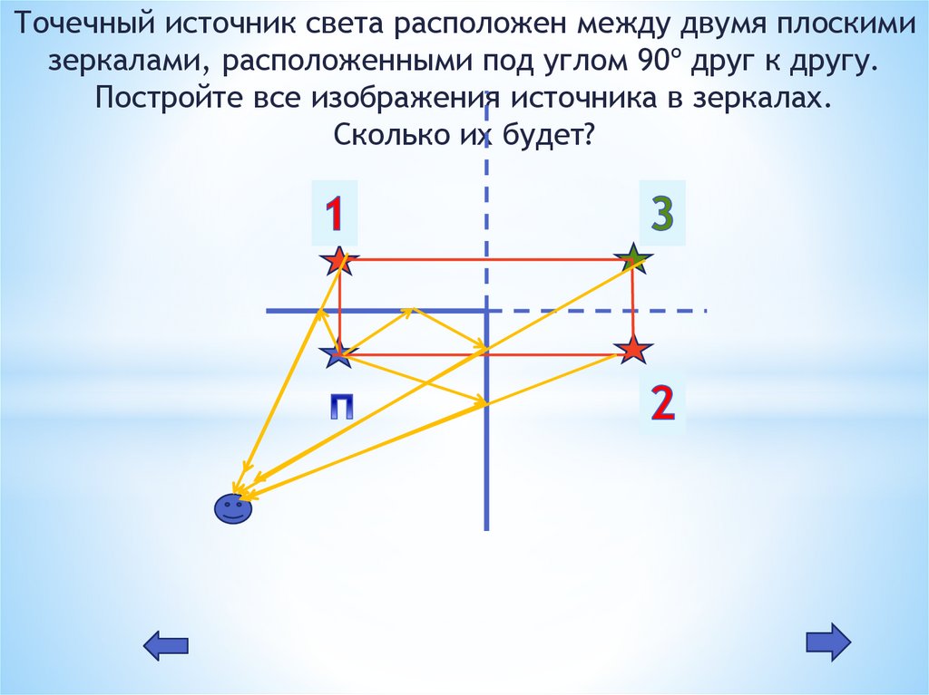 Точечный источник света расположен между двумя плоскимизеркалами, расположенными под углом 90º друг к другу.