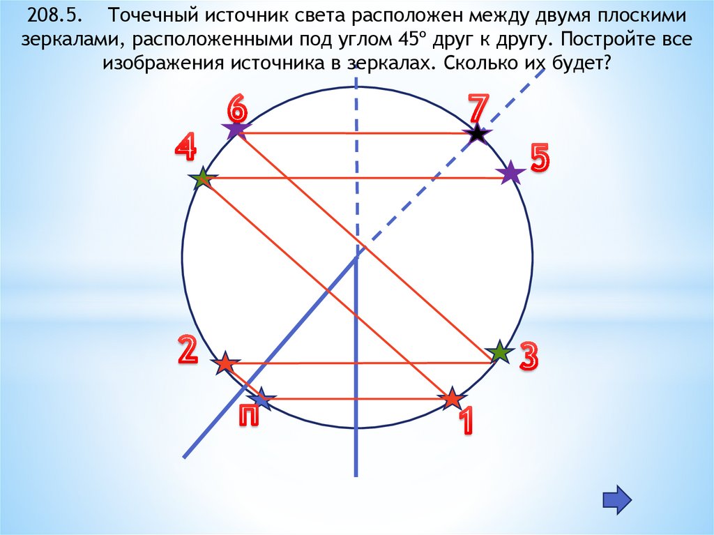 208.5. Точечный источник света расположен между двумя плоскимизеркалами, расположенными под углом 45º друг к другу. Постройте все