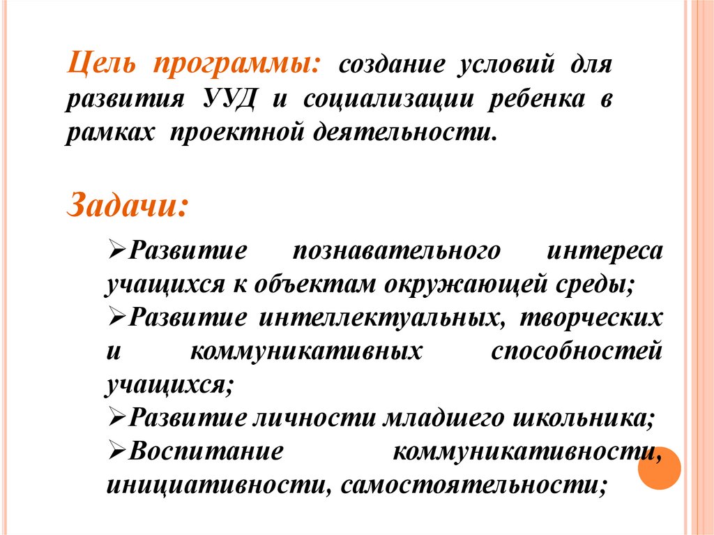 Цель программы: создание условий дляразвития УУД и социализации ребенка в