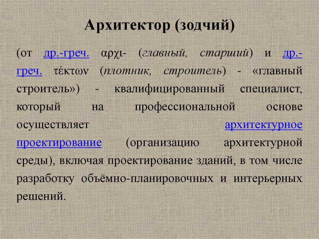 Архитектор (зодчий)(от др.-греч. αρχι- (главный, старший) и др.греч. τέκτων (плотник, строитель) - «главный