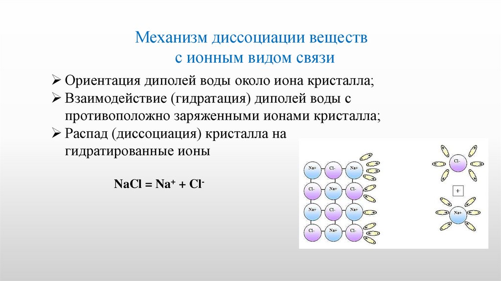 Механизм диссоциации веществс ионным видом связи