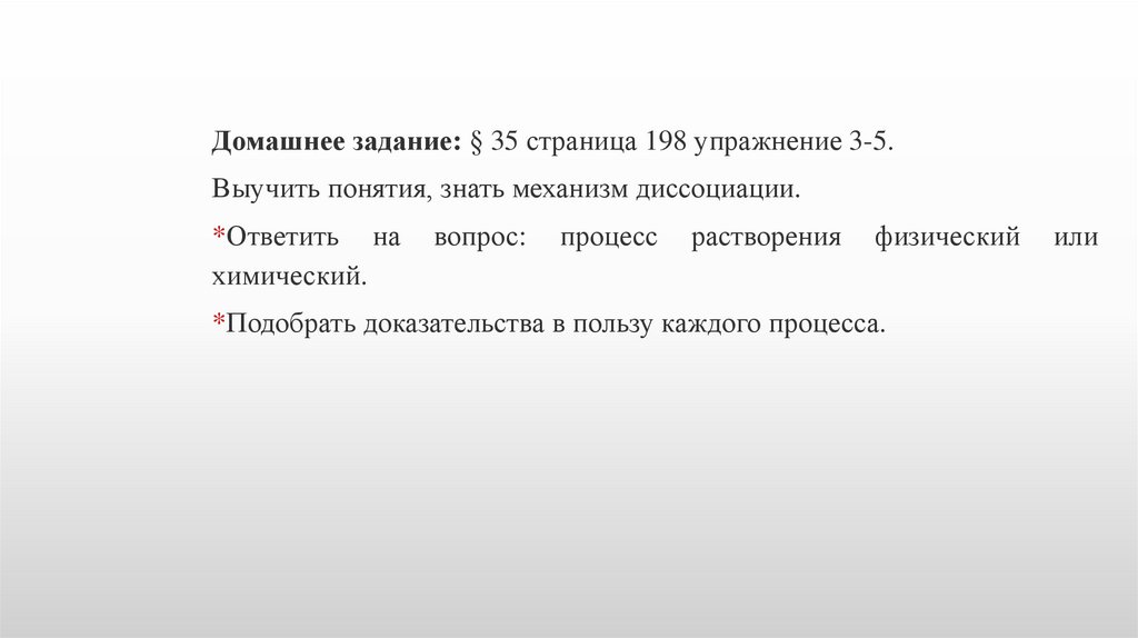 Домашнее задание: § 35 страница 198 упражнение 3-5.Выучить понятия, знать механизм диссоциации.