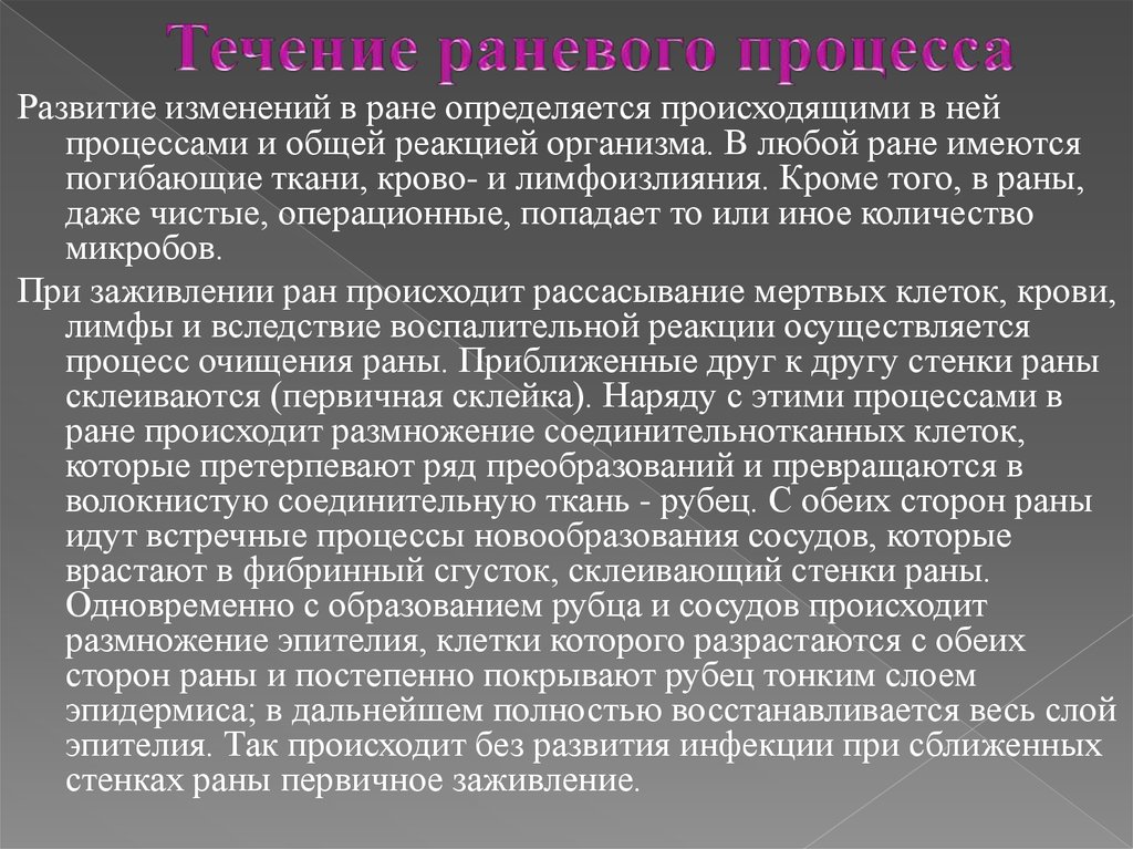 Развитие изменений в ране определяется происходящими в нейпроцессами и общей реакцией организма. В любой ране имеются