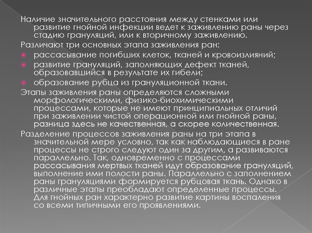 Наличие значительного расстояния между стенками илиразвитие гнойной инфекции ведет к заживлению раны через