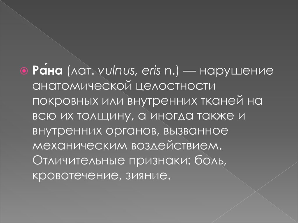 Ра́на (лат. vulnus, eris n.) — нарушениеанатомической целостности