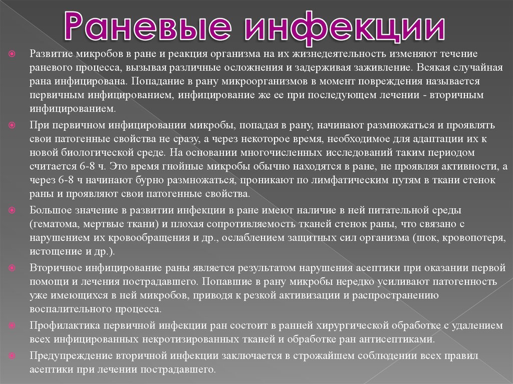 Развитие микробов в ране и реакция организма на их жизнедеятельность изменяют течениераневого процесса, вызывая различные осложнения и задерживая заживление. Всякая случайная