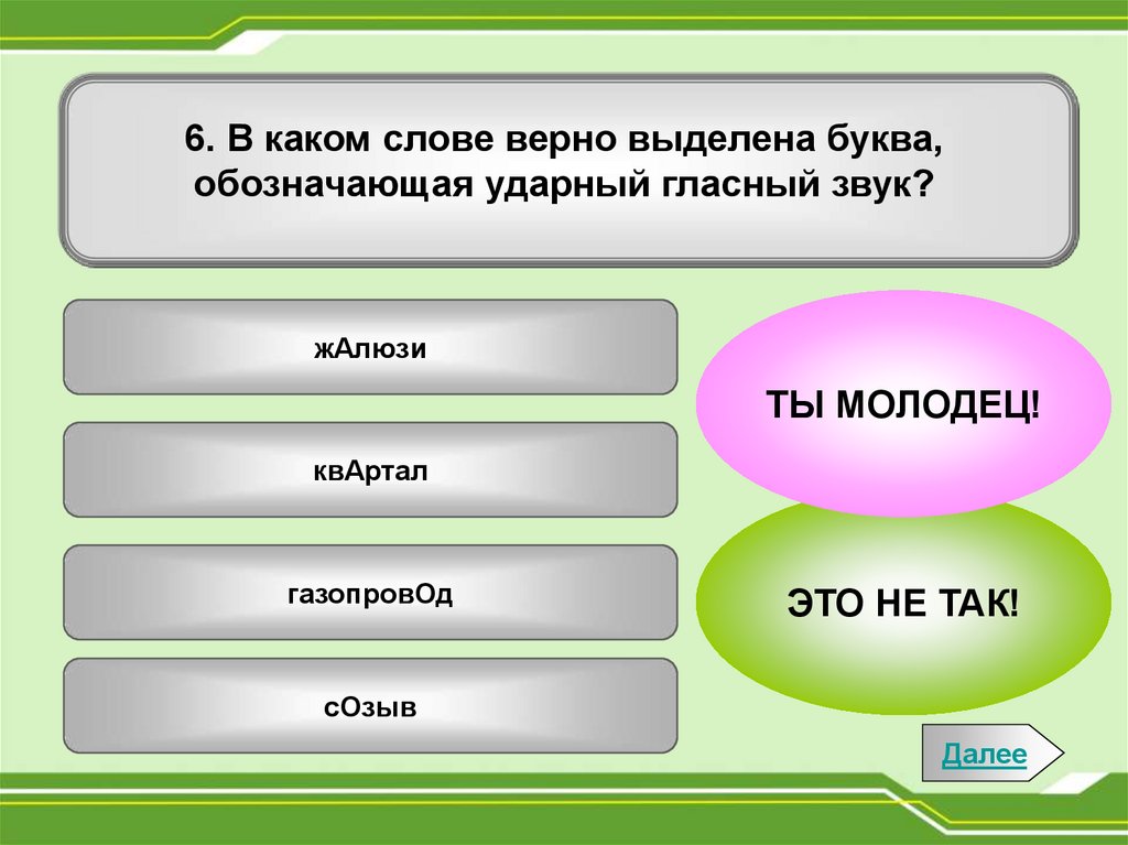 6. В каком слове верно выделена буква,обозначающая ударный гласный звук?