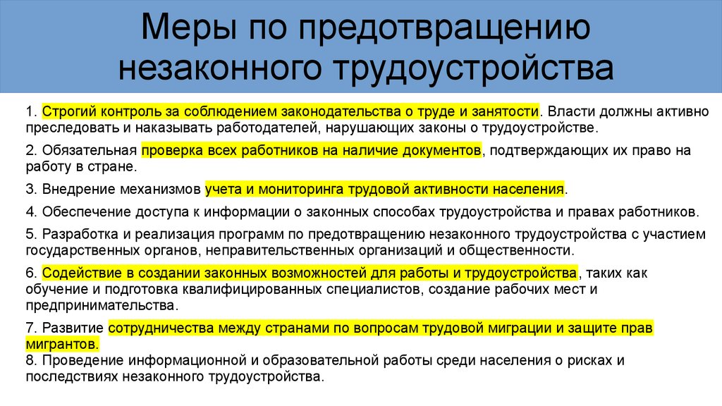 1. Строгий контроль за соблюдением законодательства о труде и занятости. Власти должны активно