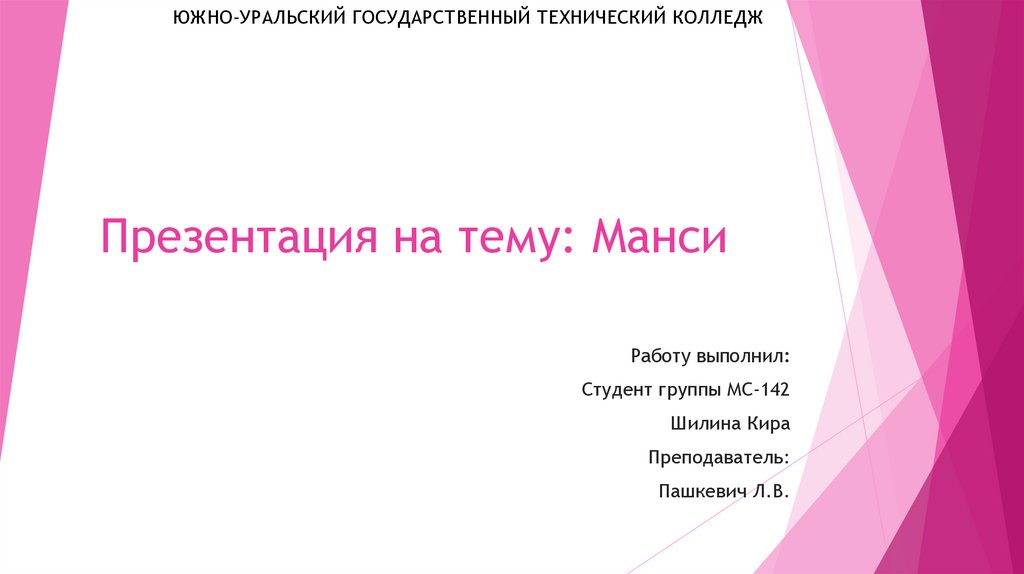 ЮЖНО-УРАЛЬСКИЙ ГОСУДАРСТВЕННЫЙ ТЕХНИЧЕСКИЙ КОЛЛЕДЖПрезентация на тему: Манси