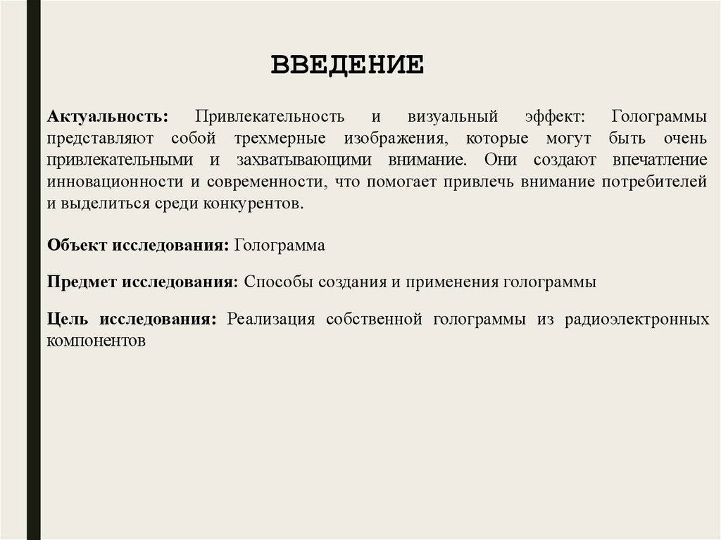 ВВЕДЕНИЕАктуальность: Привлекательность и визуальный эффект: Голограммы
