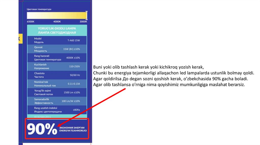 Buni yoki olib tashlash kerak yoki kichikroq yozish kerak,Chunki bu energiya tejamkorligi allaqachon led lampalarda ustunlik bolmay qoldi.