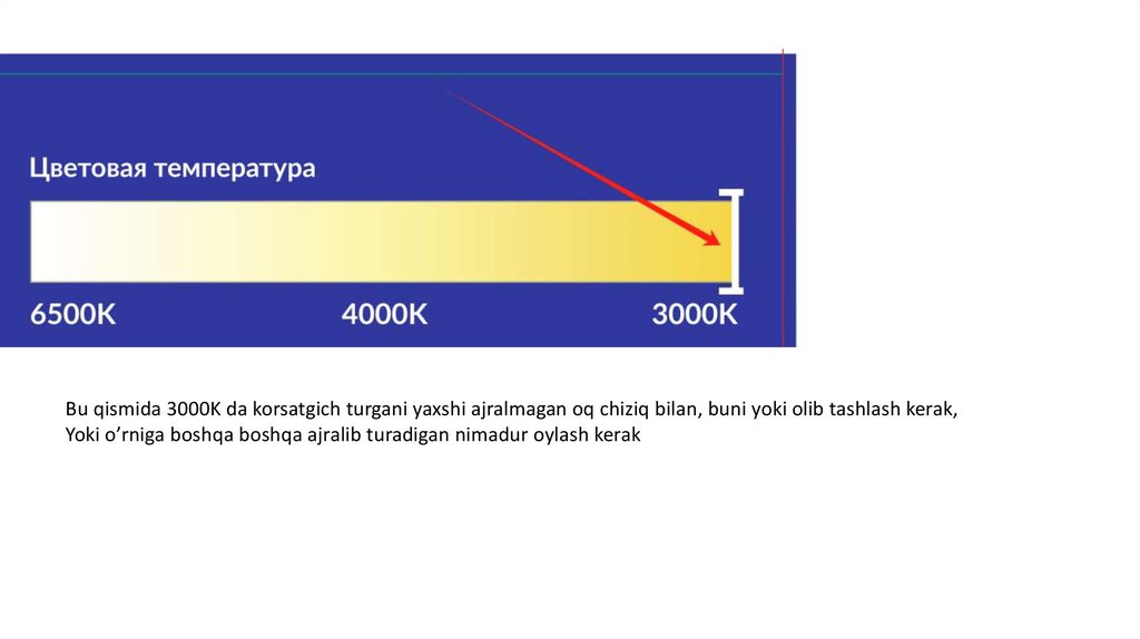 Bu qismida 3000K da korsatgich turgani yaxshi ajralmagan oq chiziq bilan, buni yoki olib tashlash kerak,Yoki o’rniga boshqa boshqa ajralib turadigan nimadur oylash kerak