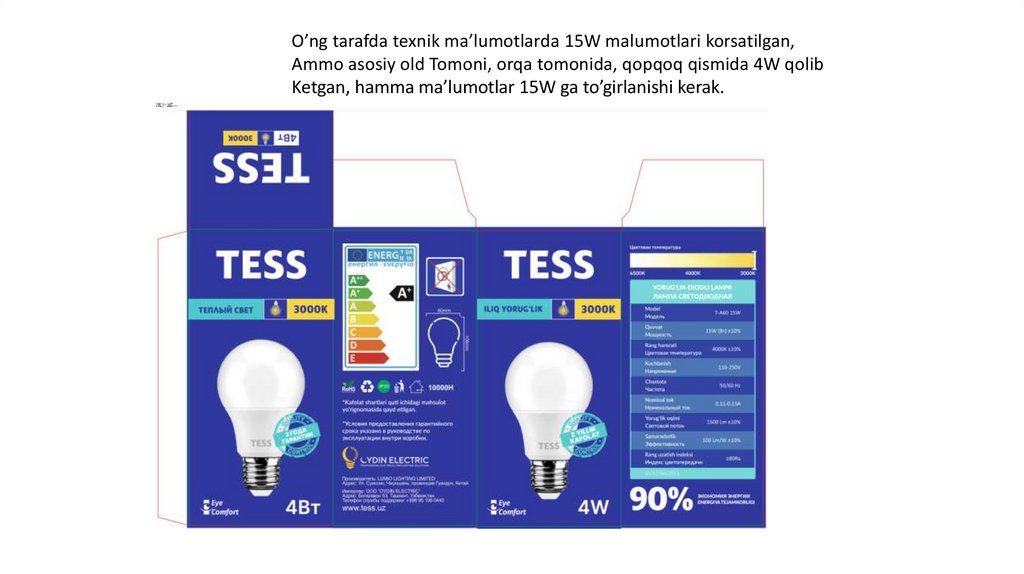 O’ng tarafda texnik ma’lumotlarda 15W malumotlari korsatilgan,Ammo asosiy old Tomoni, orqa tomonida, qopqoq qismida 4W qolib