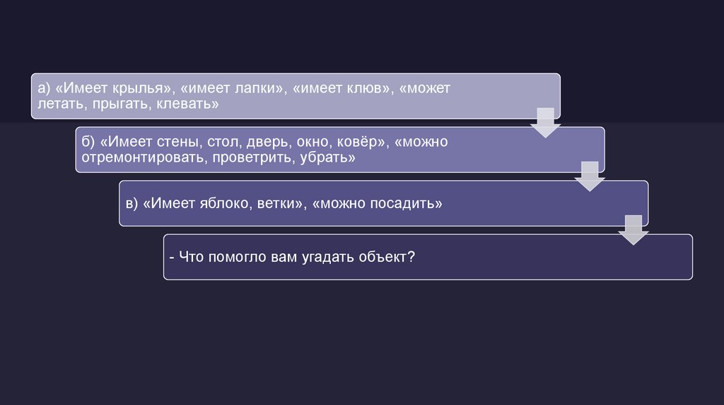 а) «Имеет крылья», «имеет лапки», «имеет клюв», «можетлетать, прыгать, клевать»