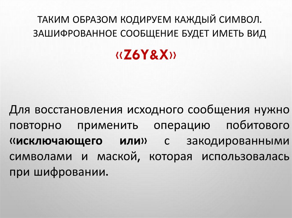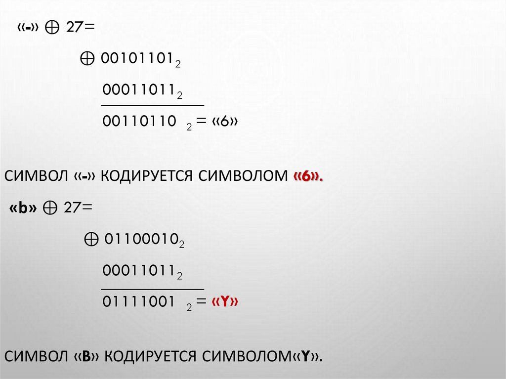 3.ВЫПОЛНИМ ПОРАЗРЯДНУЮ ОПЕРАЦИЮ «ИСКЛЮЧАЮЩЕЕ ИЛИ»МЕЖДУ КОДОМ КАЖДОГО СИМВОЛА И МАСКОЙ.
