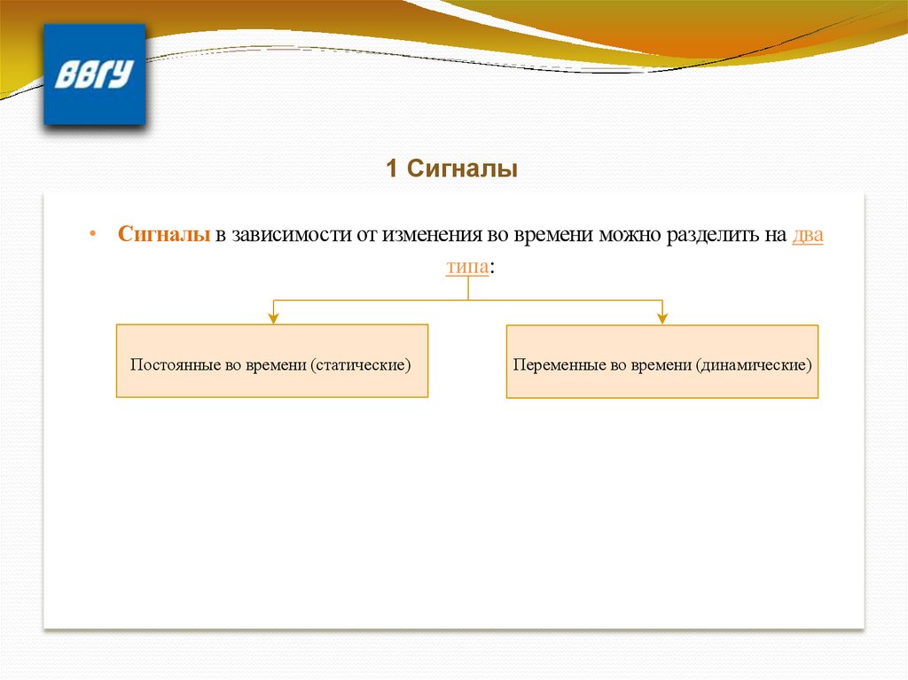1 Сигналы• Сигналы в зависимости от изменения во времени можно разделить на два
