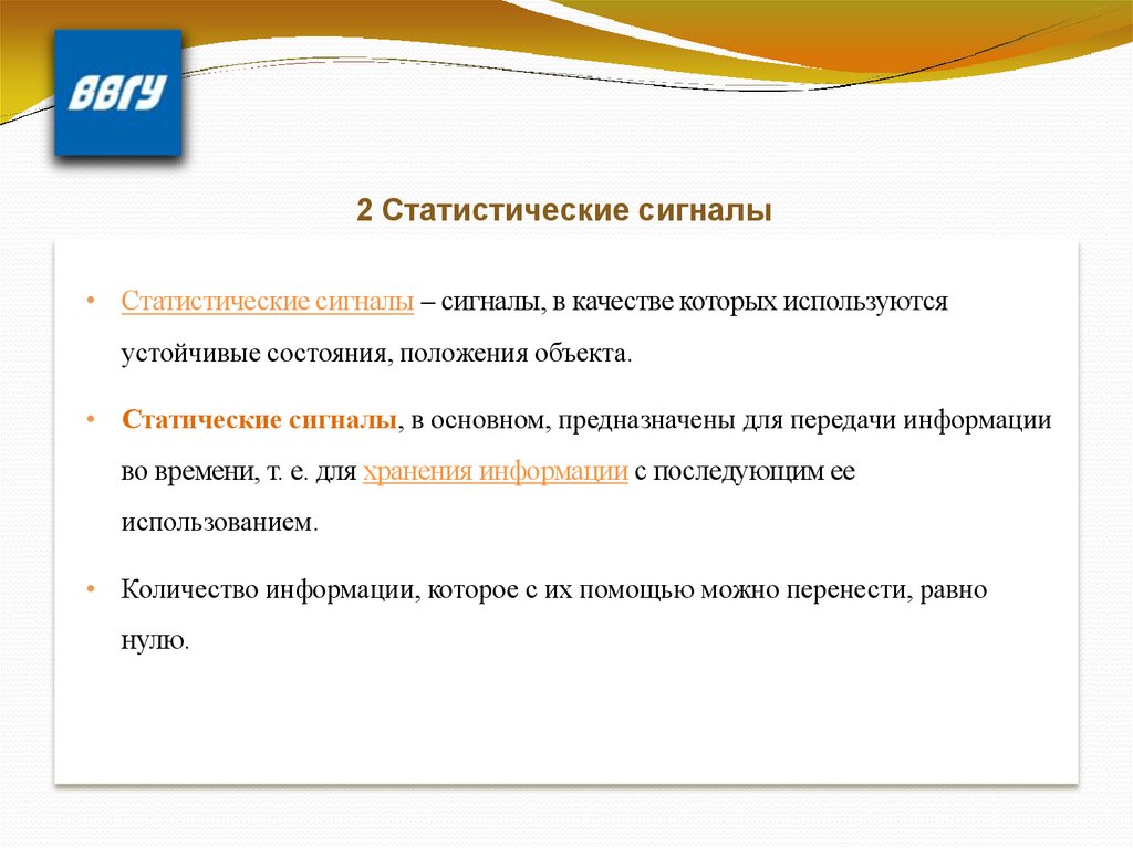 2 Статистические сигналы• Статистические сигналы – сигналы, в качестве которых используются