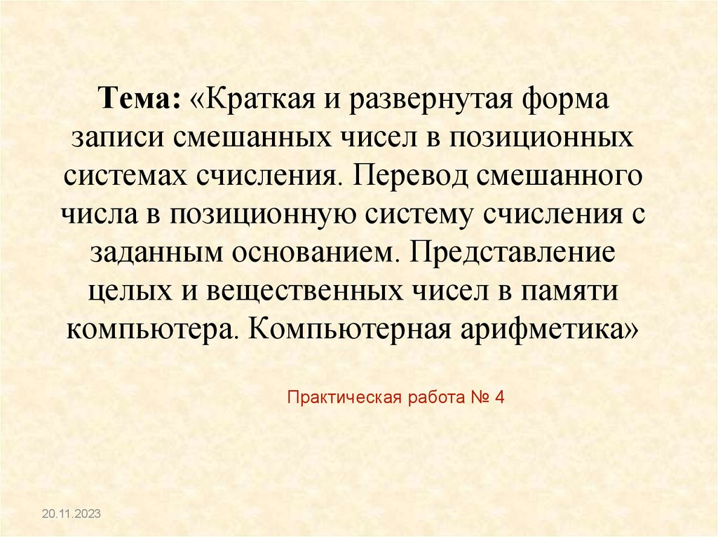 1. Тема: «Краткая и развернутая форма записи смешанных чисел в позиционных системах счисления. Перевод смешанного числа в