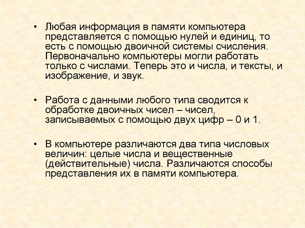 • Любая информация в памяти компьютерапредставляется с помощью нулей и единиц, то