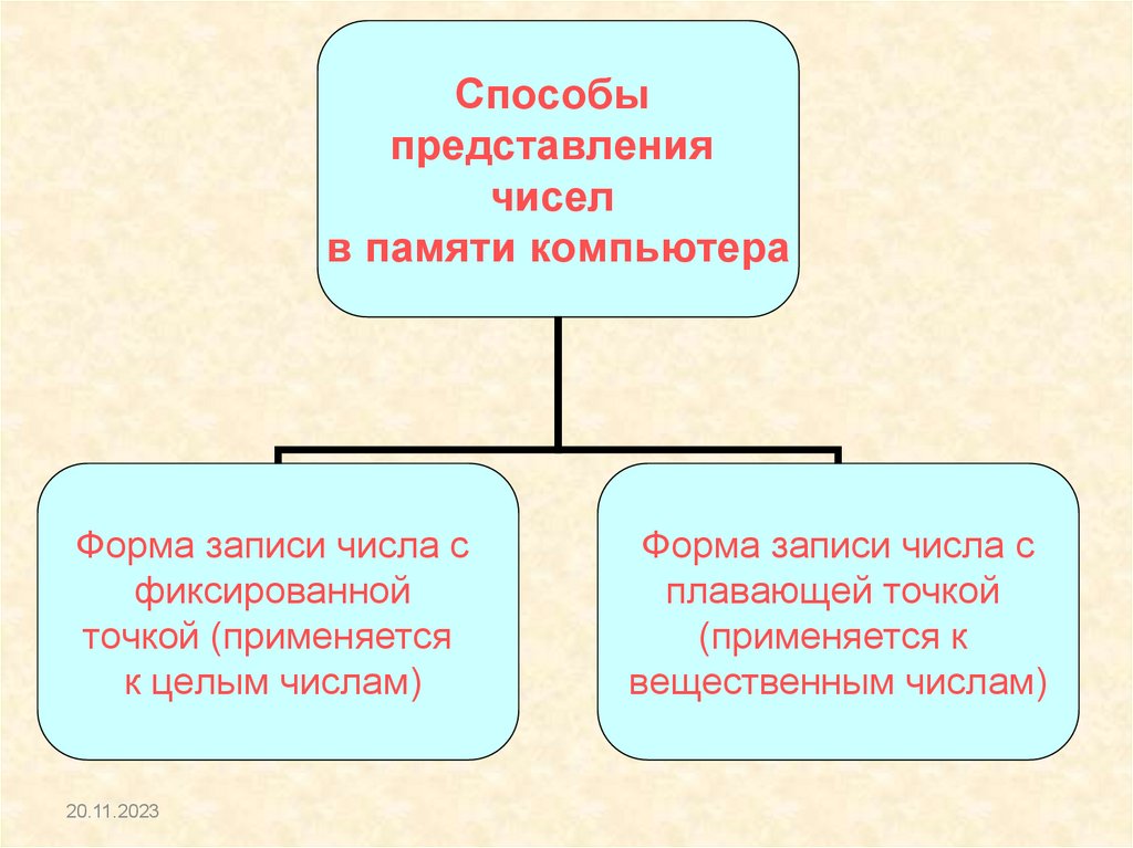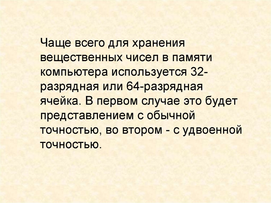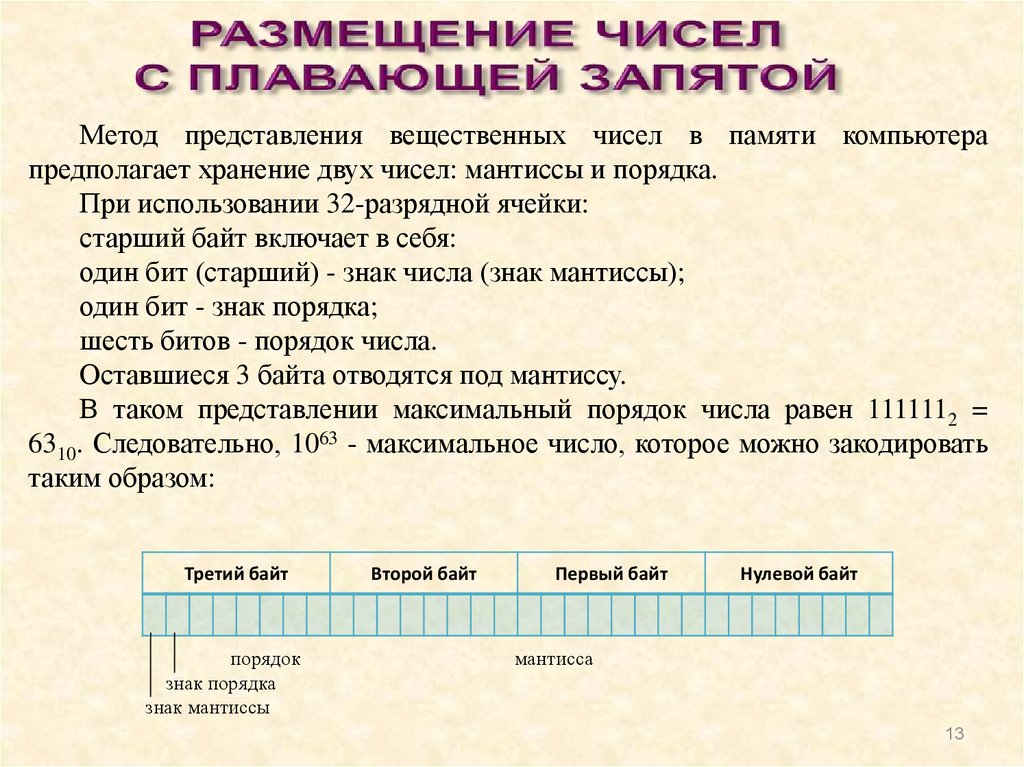 Метод представления вещественных чисел в памяти компьютерапредполагает хранение двух чисел: мантиссы и порядка.