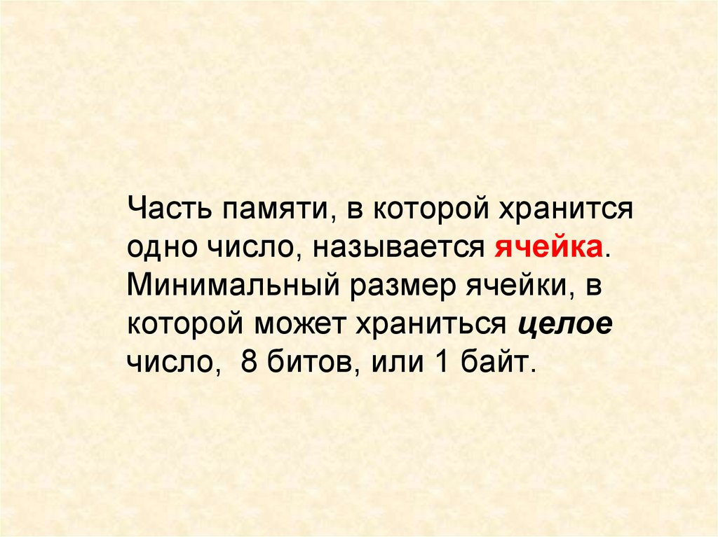 Часть памяти, в которой хранитсяодно число, называется ячейка.
