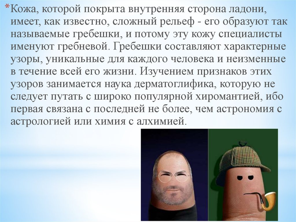 * Кожа, которой покрыта внутренняя сторона ладони,имеет, как известно, сложный рельеф - его образуют так