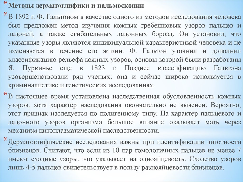 * Методы дерматоглифики и пальмоскопии* В 1892 г. Ф. Гальтоном в качестве одного из методов исследования человека