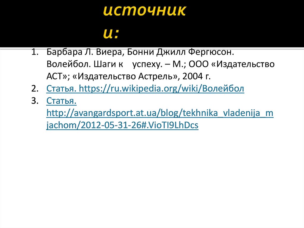 1. Барбара Л. Виера, Бонни Джилл Фергюсон.Волейбол. Шаги к успеху. – М.; ООО «Издательство