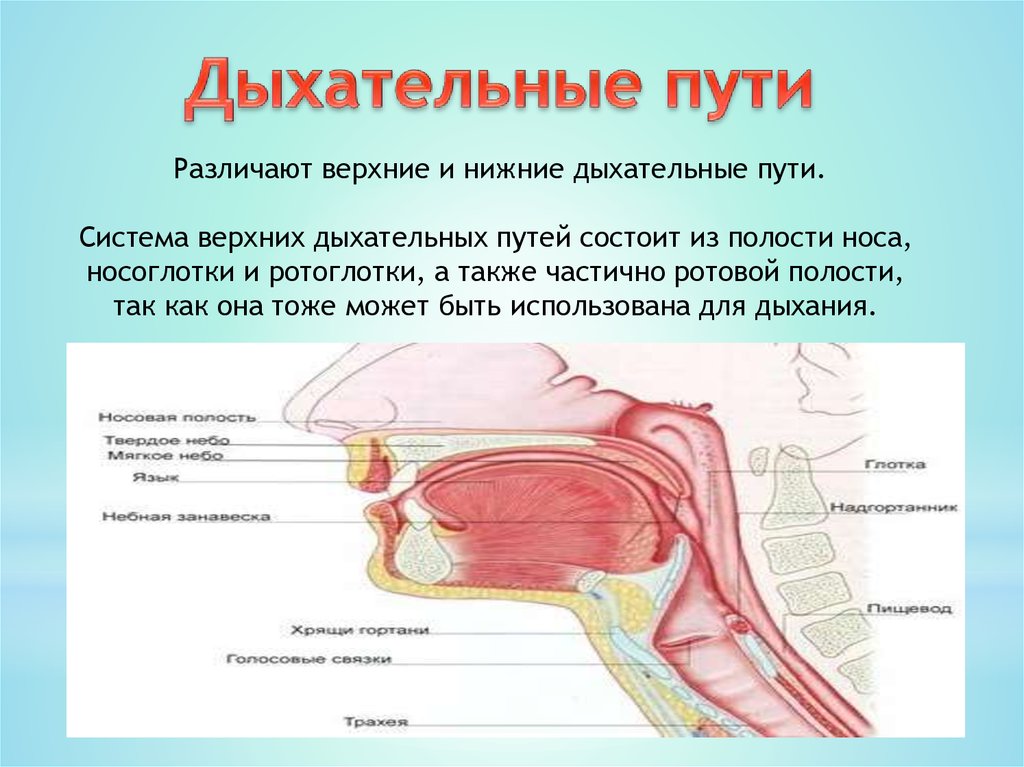 Различают верхние и нижние дыхательные пути.Система верхних дыхательных путей состоит из полости носа,