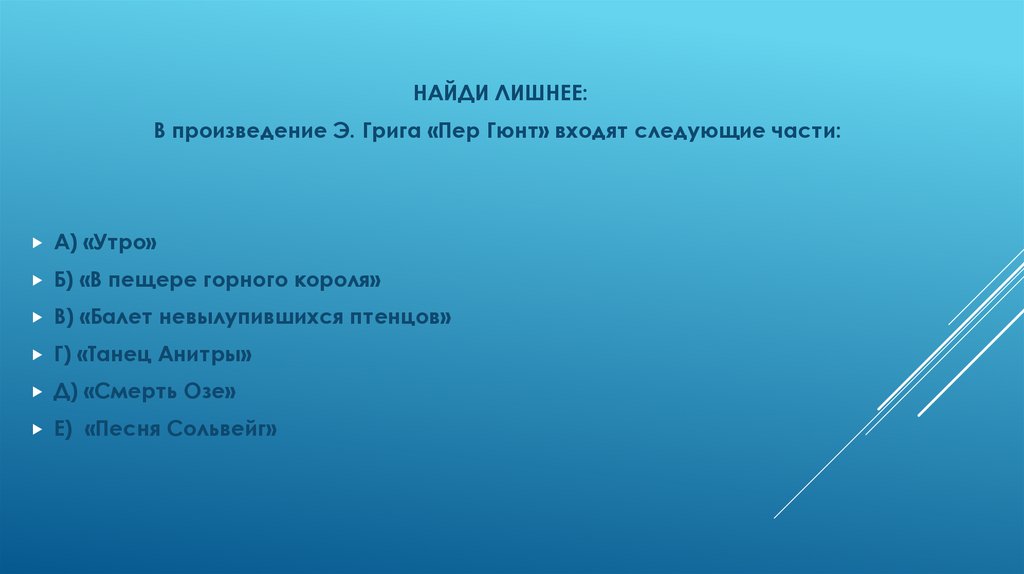 НАЙДИ ЛИШНЕЕ:В произведение Э. Грига «Пер Гюнт» входят следующие части: